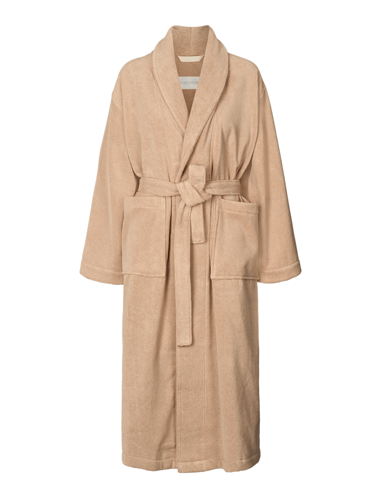 A spacious bathrobe with large, deep pockets and a soft, comfortable collar you can wrap yourself in after a bath, a dip in the sea, or simply when relaxing on the sofa.