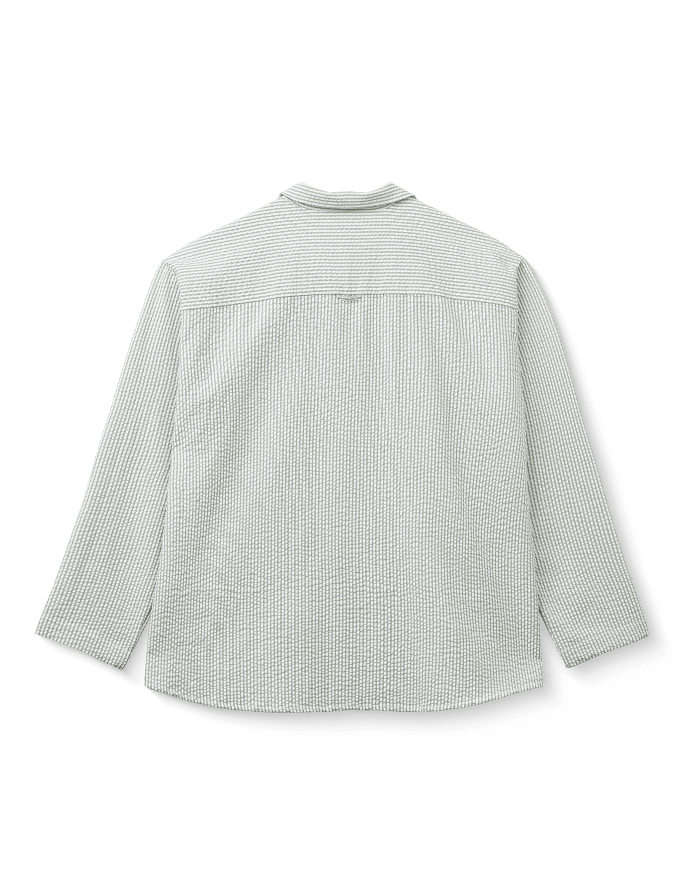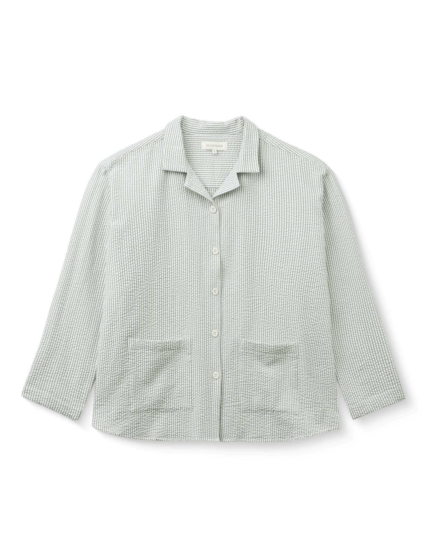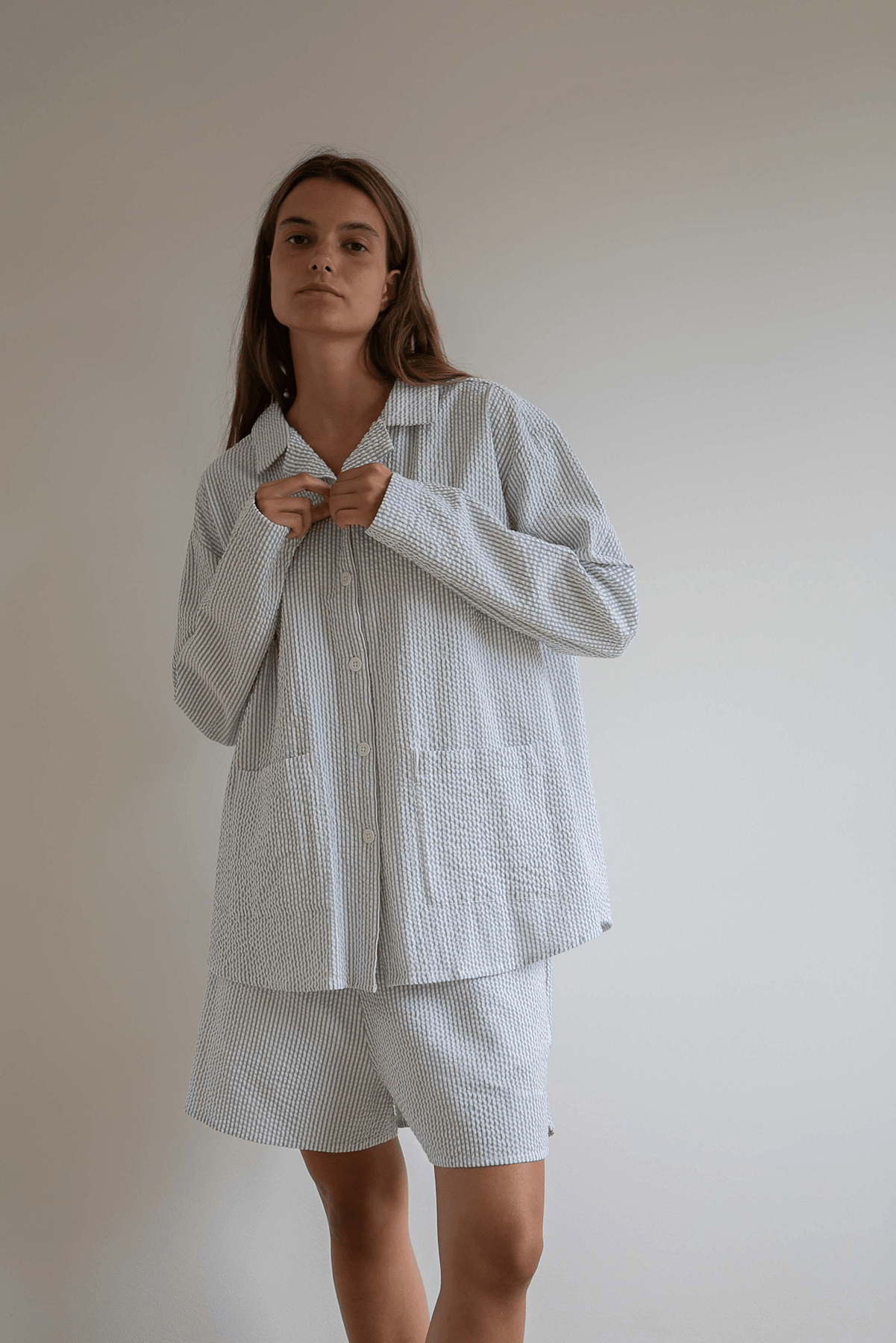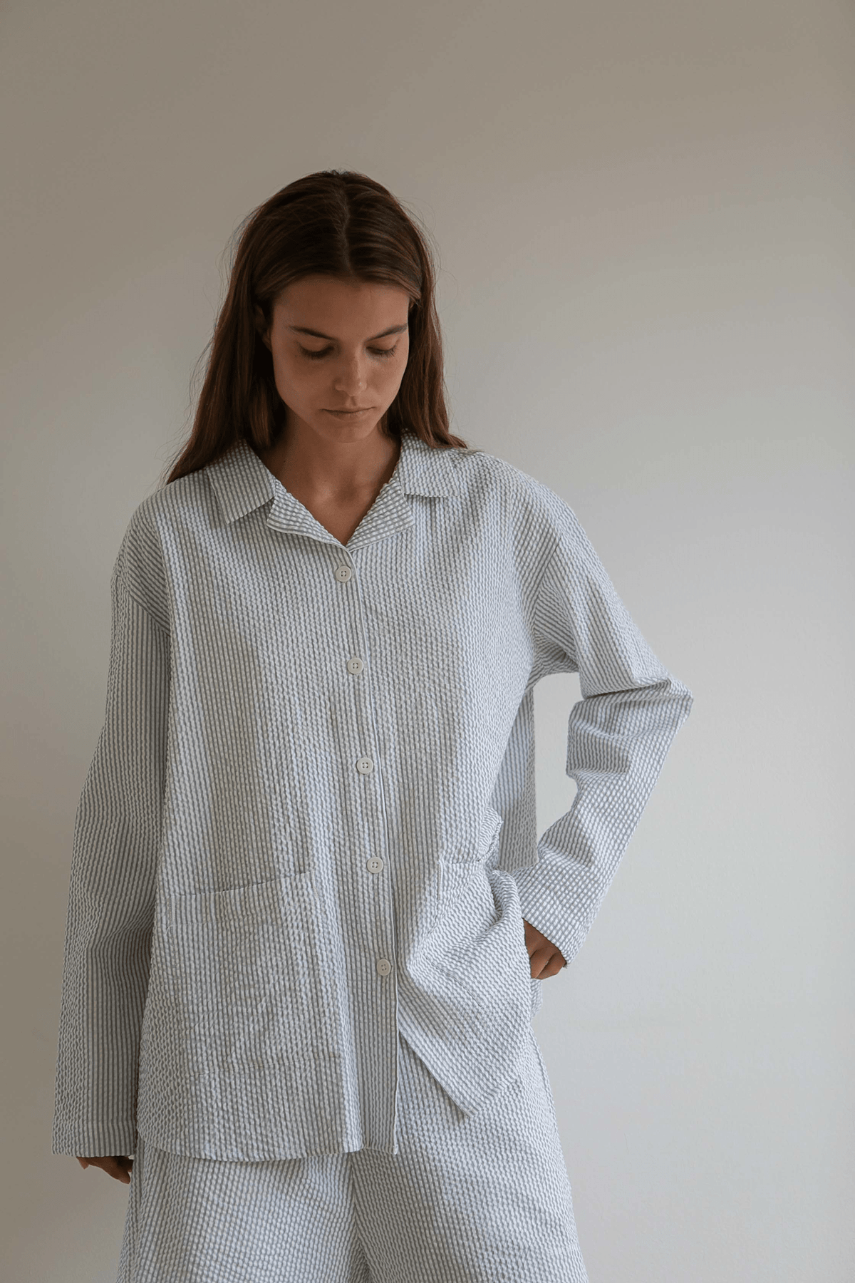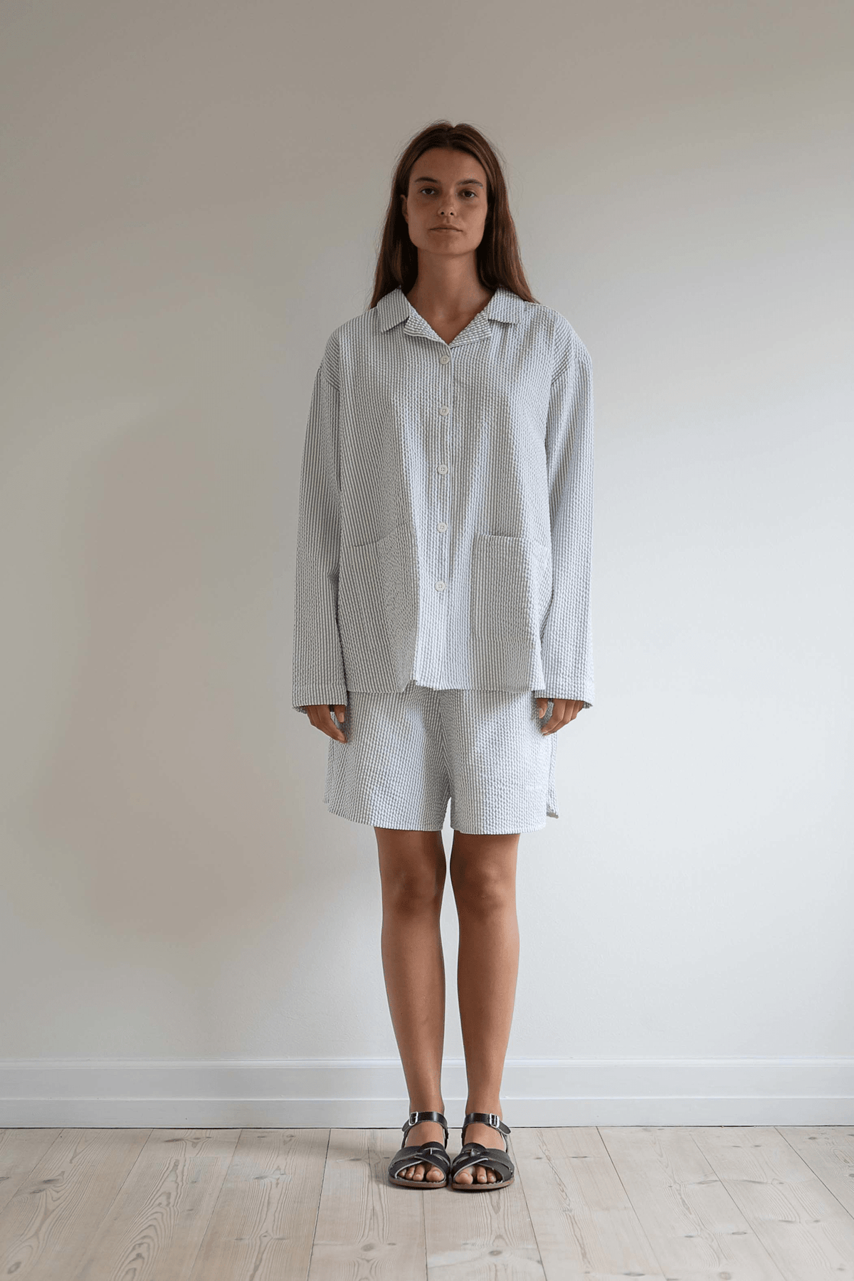 Soft shirt in organic cotton seersucker. The shirt has a splendid design with two front pockets, buttoned through with large buttons and an oversize, classic cut. All interior stitching is French seamed to get a delicate and luxurious finish. Silja shirt can be used for most purposes. On a warm summer day, the shirt looks great together with, for example, our Jasmin shorts either in the same color, a contrasting color or one of the beautiful patterns. On cooler days, the Silja shirt can be paired with long trousers such as Bella pants.The shirt is normal in size and has a loose fit.