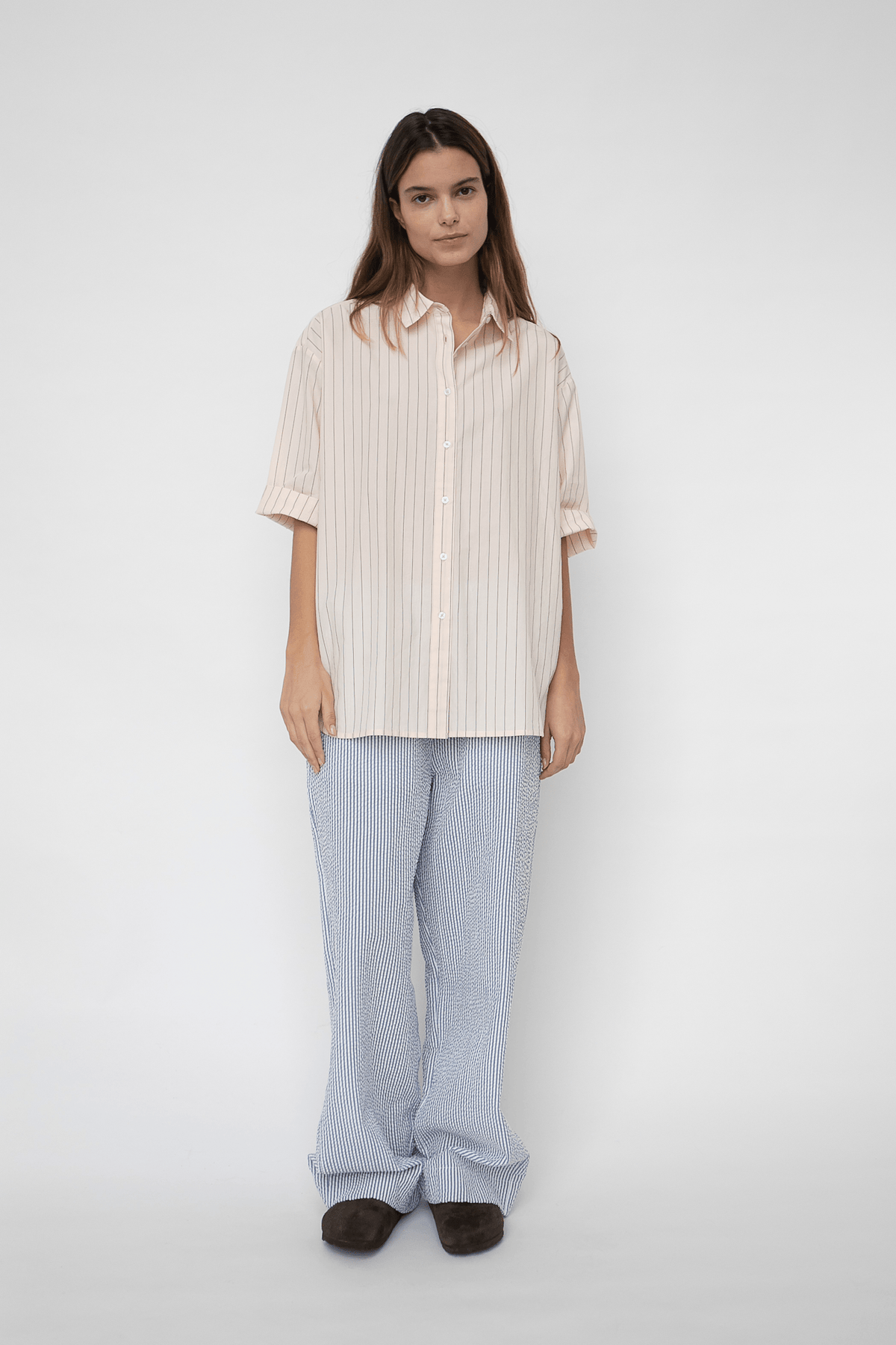 Beautiful, wide trousers in a light, organic cotton seersucker. The trousers have wide legs, a loose silhouette, elastic band at the waist and two side pockets at the front. All interior stitching is French seamed to get a delicate and luxurious finish. Bella pants can be styled with a knit, a Freya t-shirt or the sleeveless Sloane t-shirt for a relaxed look, or one of our fine shirts - either in the same color or a contrasting color - if you want a slightly more formal, but still casual look.