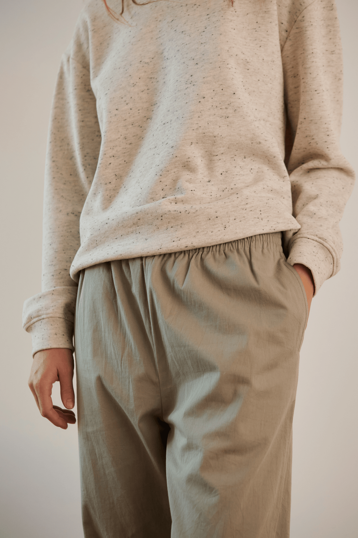 Beautiful pants with straight legs in organic cotton. The pants has straigt legs with a sligtly narrowed ankle, wide elastic waistband and pockets, both front and back. All interior stitching is French seamed to get a delicate and luxurious finish.