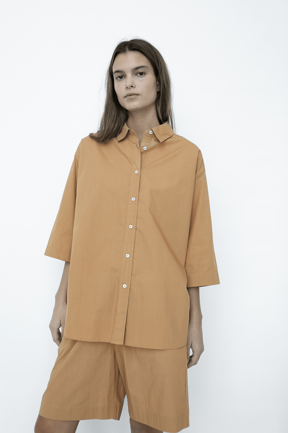 Nice shirt in an oversized and men's-inspired fit with short sleeves, plain collar and buttoned placket closure. The Cecilia shirt is produced in a light, organic cotton poplin, and all internal seams are French-stitched for a delicate and luxurious finish. Get a stylish, yet relaxed summer set by pairing the shirt with the classic Norah shorts or the slightly shorter Jasmin shorts. Feel free to roll-up the sleeve a bit to look more casual.