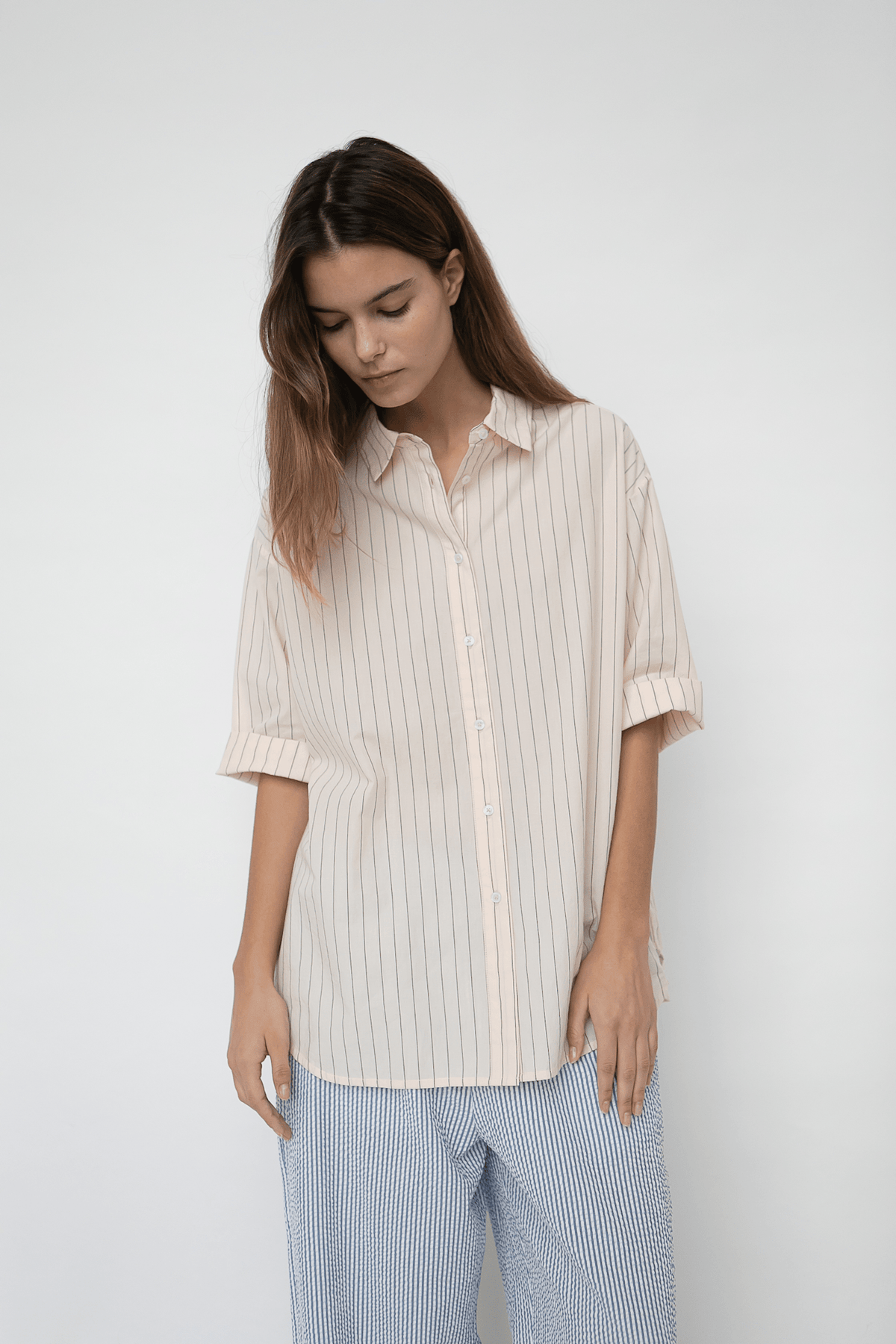 Nice shirt in an oversized and men's-inspired fit with short sleeves, plain collar and buttoned placket closure. The Cecilia shirt is produced in a light, organic cotton poplin, and all internal seams are French-stitched for a delicate and luxurious finish. Get a stylish, yet relaxed summer set by pairing the shirt with the classic Norah shorts or the slightly shorter Jasmin shorts. Feel free to roll-up the sleeve a bit to look more casual.