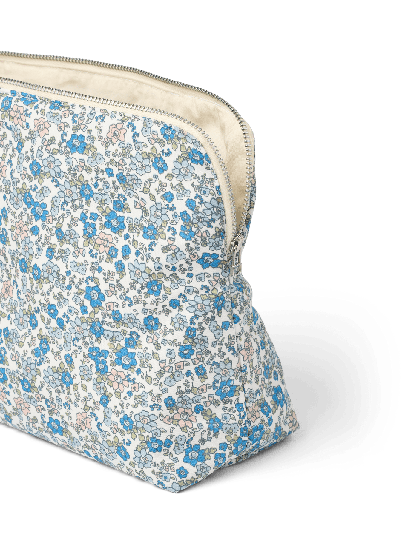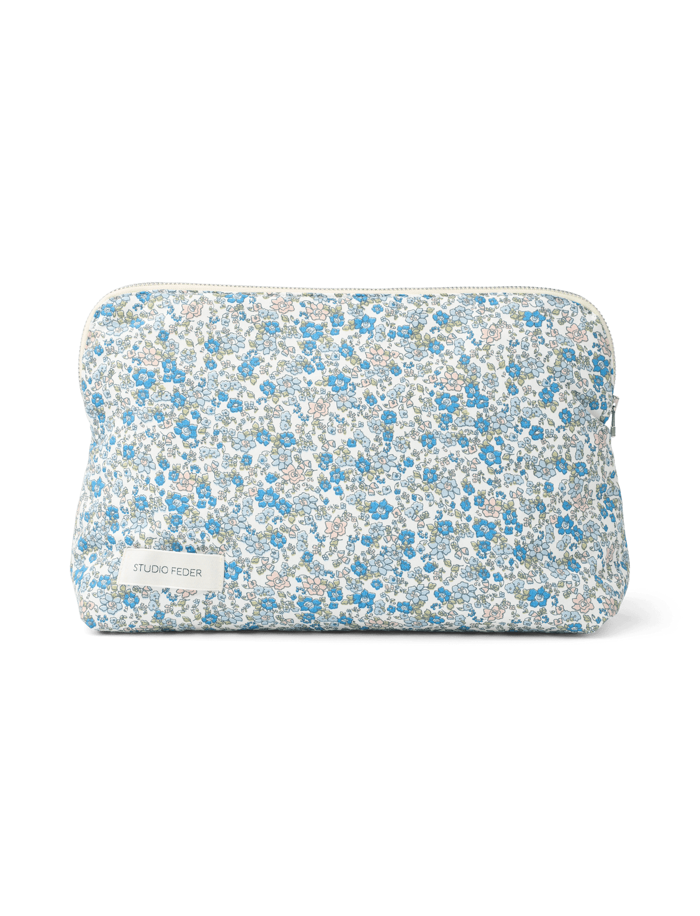 Celia toiletry bag has white cotton lining and logo in the lower left corner on the front.