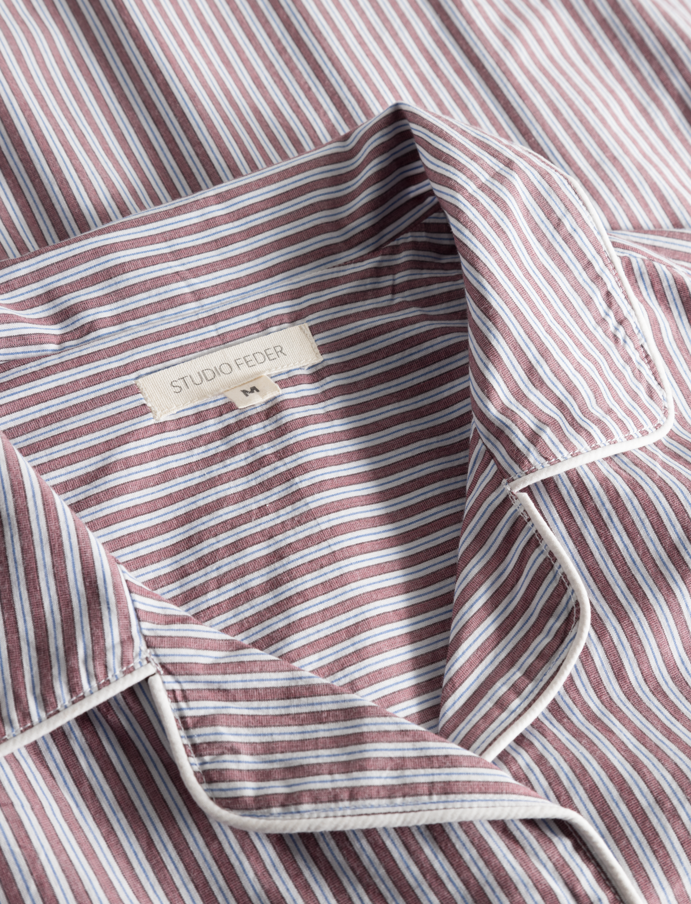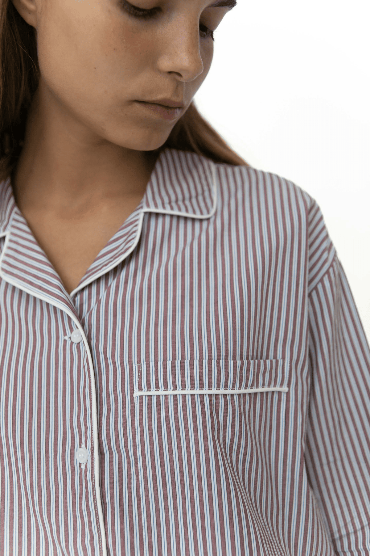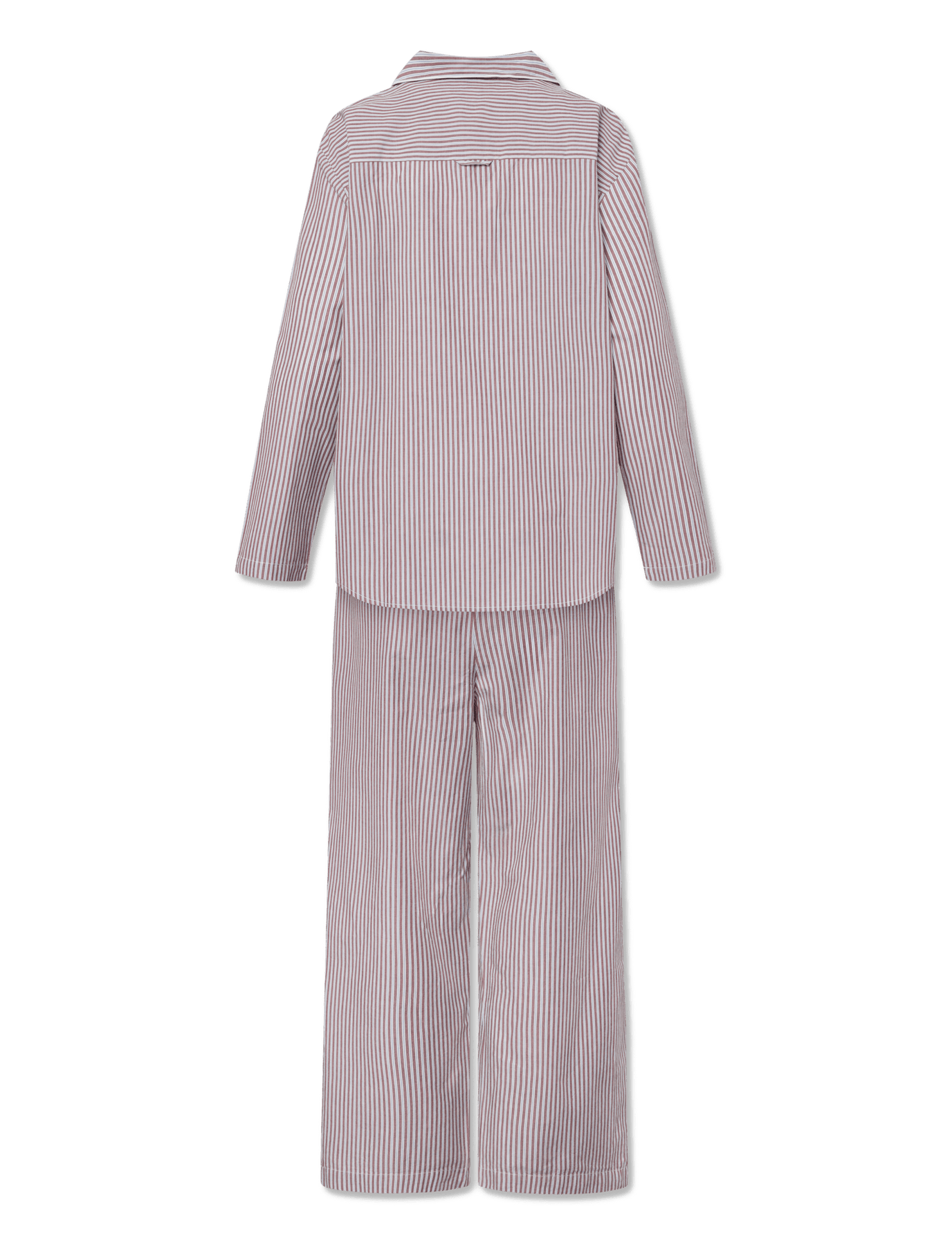 Classic, luscious and soft pajamas in organic cotton poplin. Edith pajama is wonderful to sleep in, and with its fine, stylish look, also perfect for relaxed days at home. The pajama shirt has a large breast pocket, buttoned placket closure and a beautiful contrasting piping band. The trousers are loose in cut, have an elastic band at the waist and side pockets. All interior stitching is French seamed to get a delicate and luxurious finish.