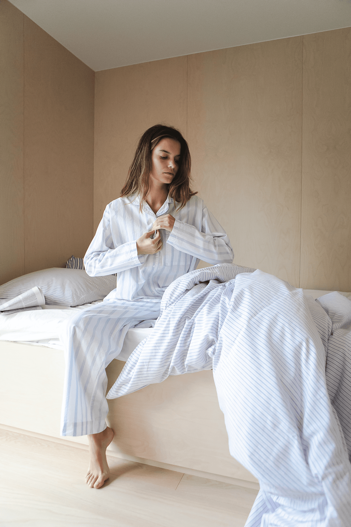 Classic, luscious and soft pajamas in organic cotton poplin. Edith pajama is wonderful to sleep in, and with its fine, stylish look, also perfect for relaxed days at home. The pajama shirt has a large breast pocket, buttoned placket closure and a beautiful contrasting piping band. The trousers are loose in cut, have an elastic band at the waist and side pockets. All interior stitching is French seamed to get a delicate and luxurious finish.