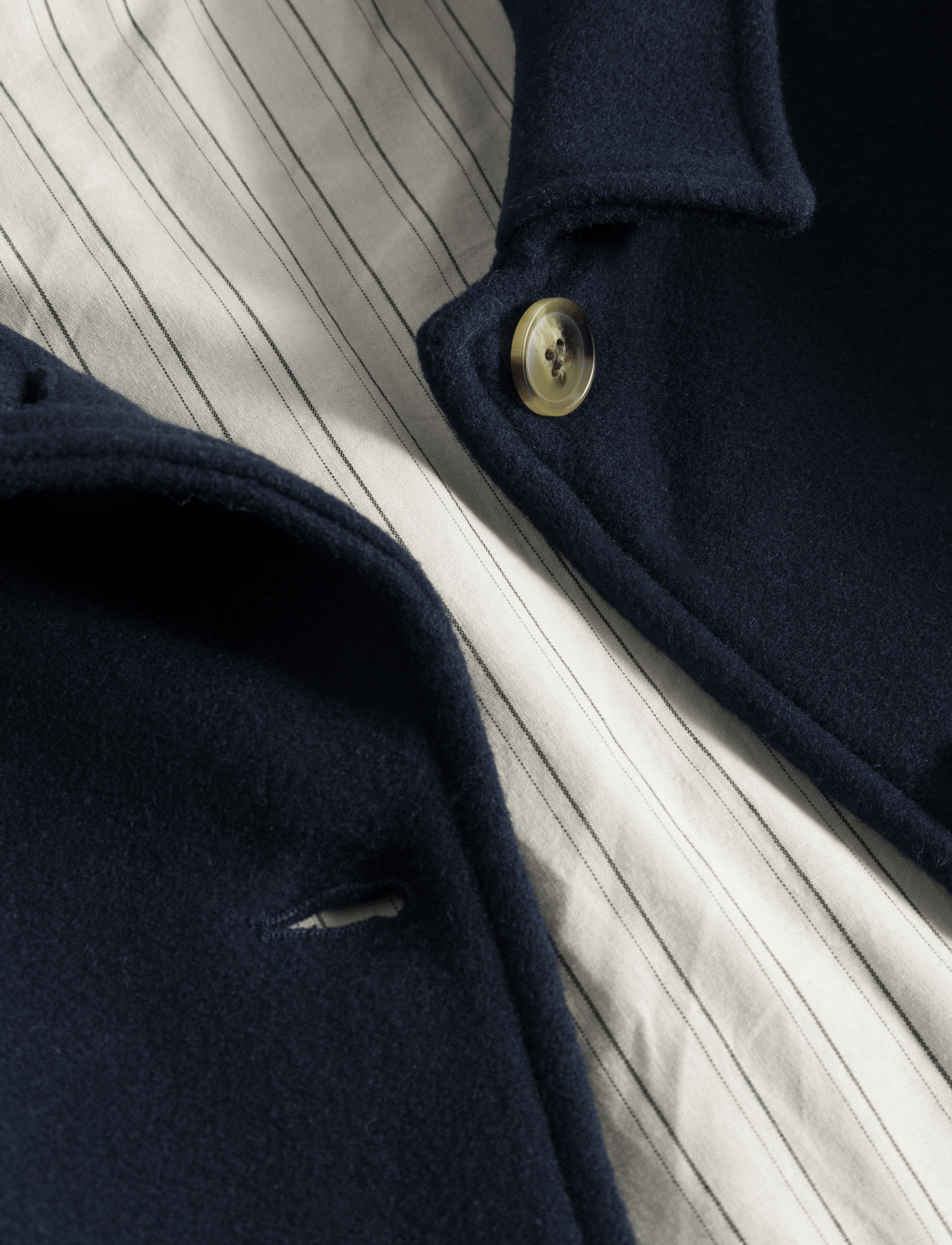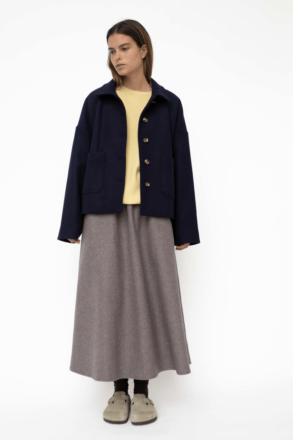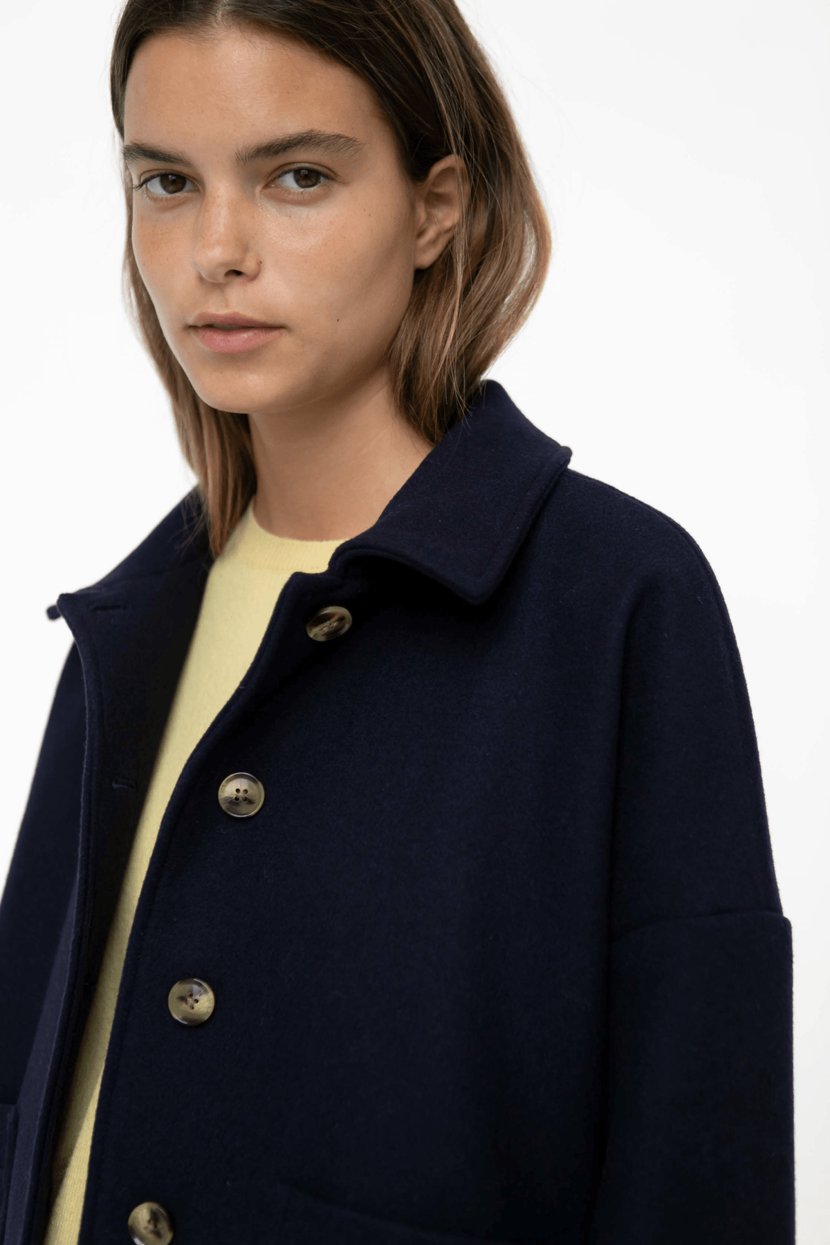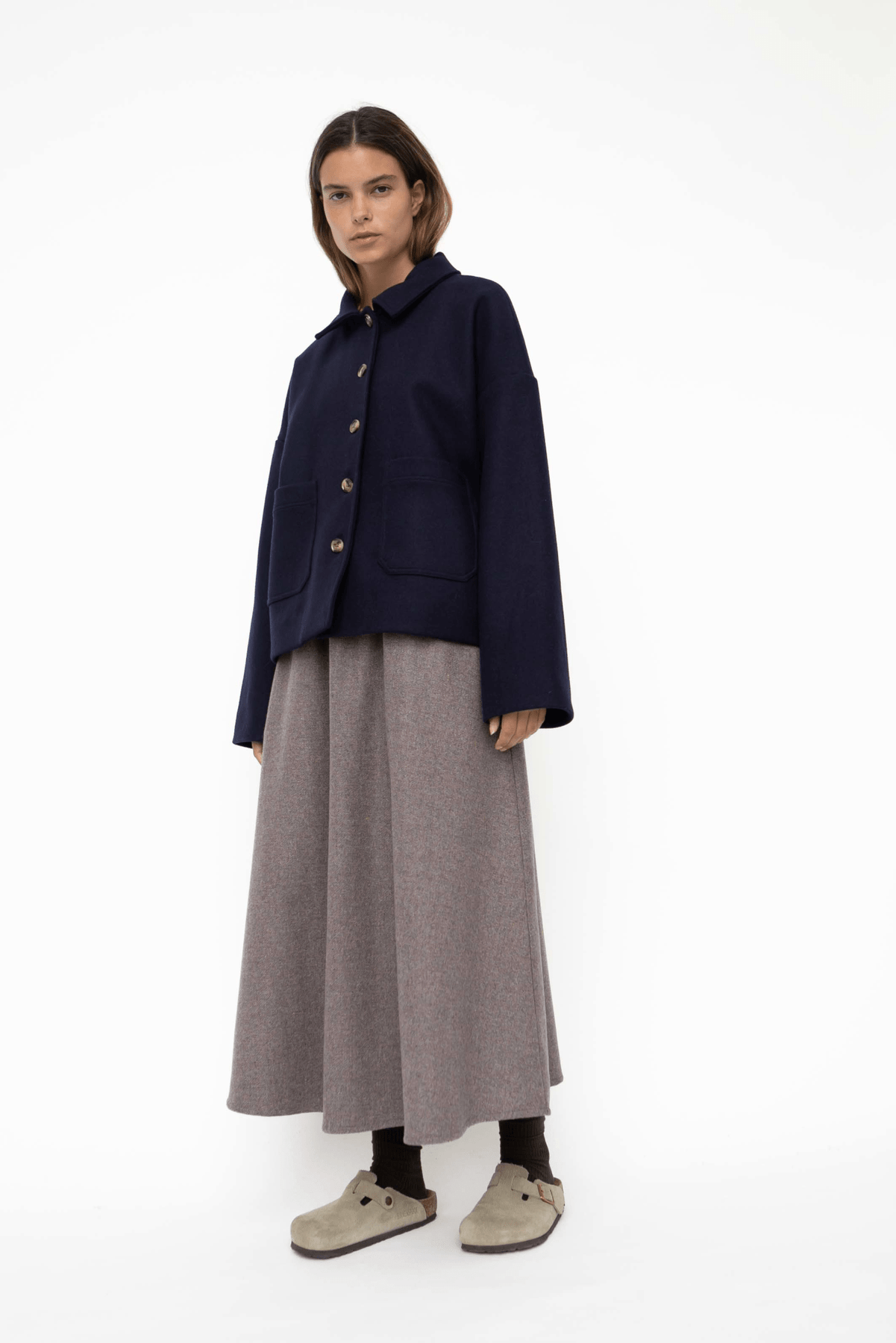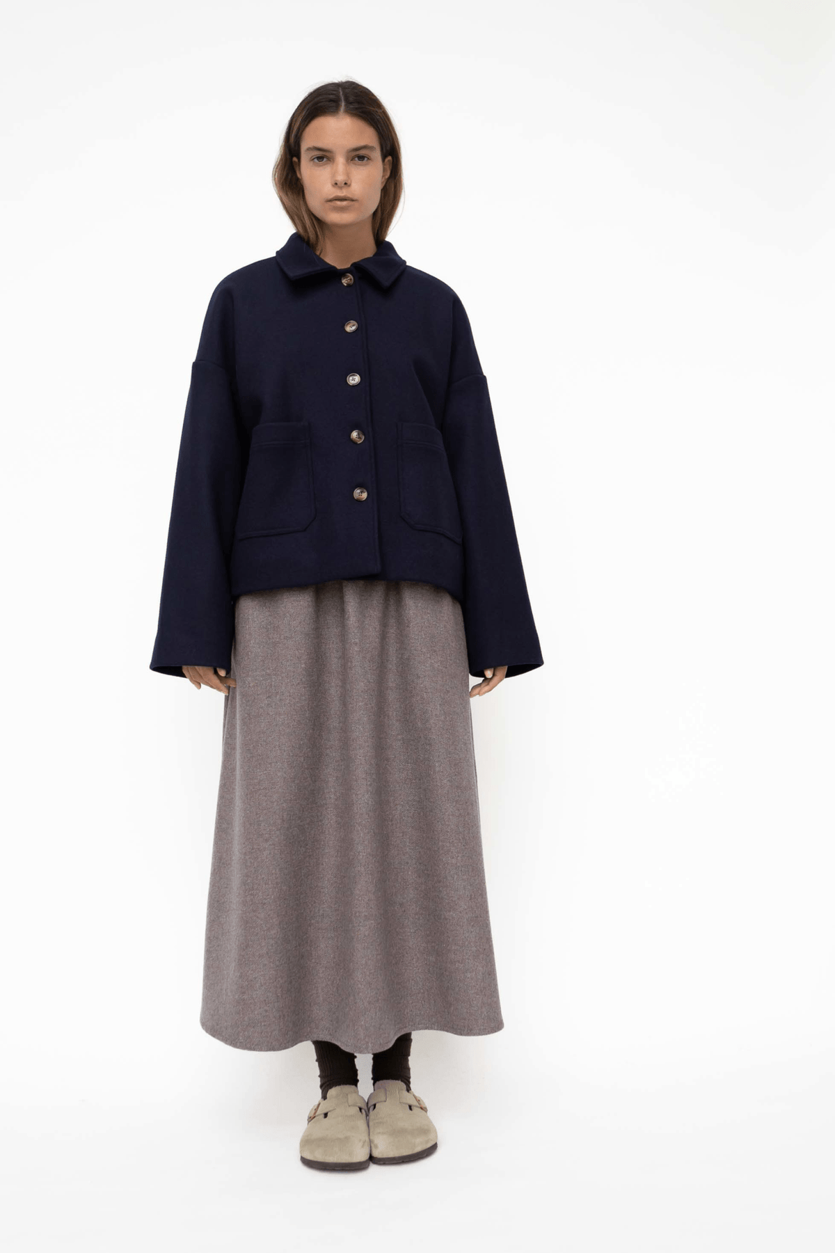 A further development of our popular Felina Jacket. Short, stylish classic jacket in a strong yet soft 100% pure RWS wool quality. A further development of our popular Felina Jacket. The jacket has a cotton lining inside with discreet stylish stripes. The jacket has a boxy oversized fit with front pockets and horn buttons. The jacket is perfect for those who want a short winter jacket that is warm and dense in the weave.