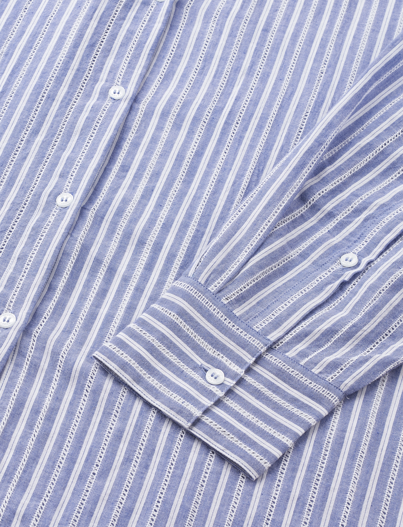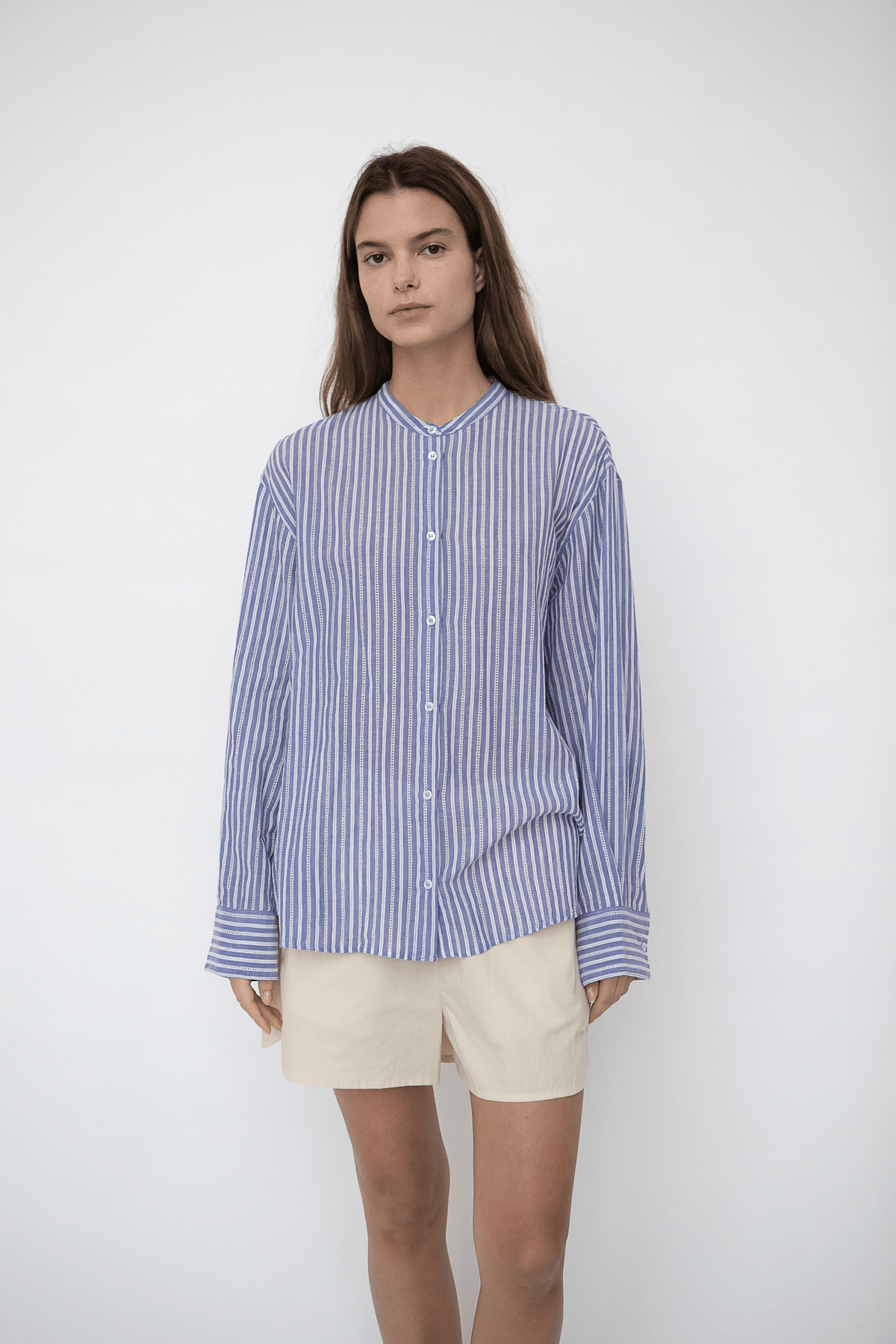 A lightweight shirt in GOTS-certified organic cotton. The shirt is with a grandad collar and small buttons at front and on sleeve cuffs. A loose fit on the body adds a feminine look to it. Use it with shorts, skirts an pants through the entire season.
