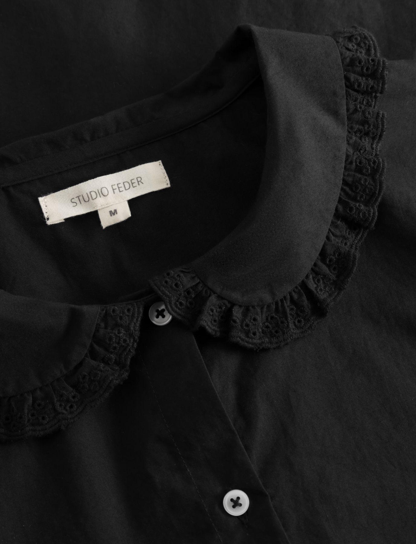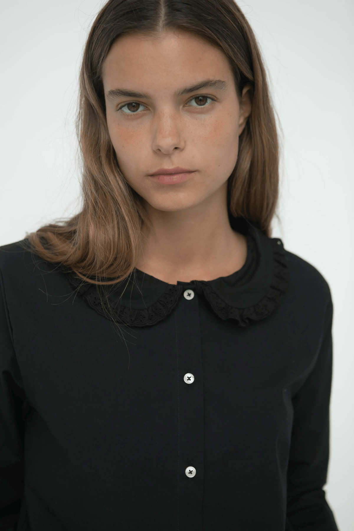Classic, luscious and soft shirt in organic cotton. Petra shirt has a button-through placket closure, large buttons and a nice, small round lace collart hat gives it a feminine touch. All interior stitching is French seamed to get a delicate and luxurious finish.