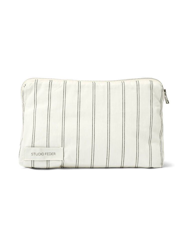 Vores lille Celia toilettaske har hvidt bomuldsfoer og logo i nederste venstre hjørne foran.