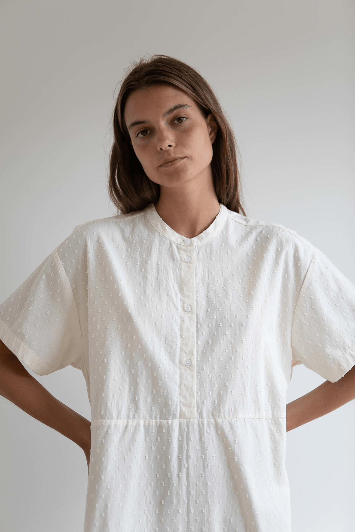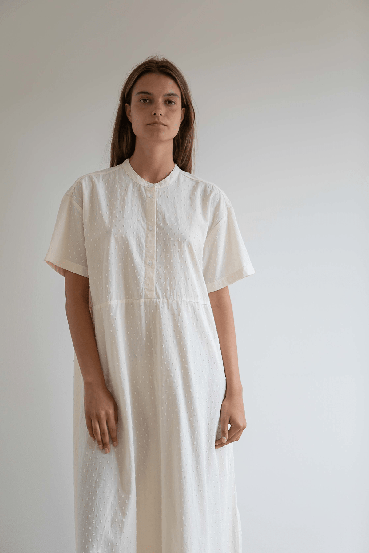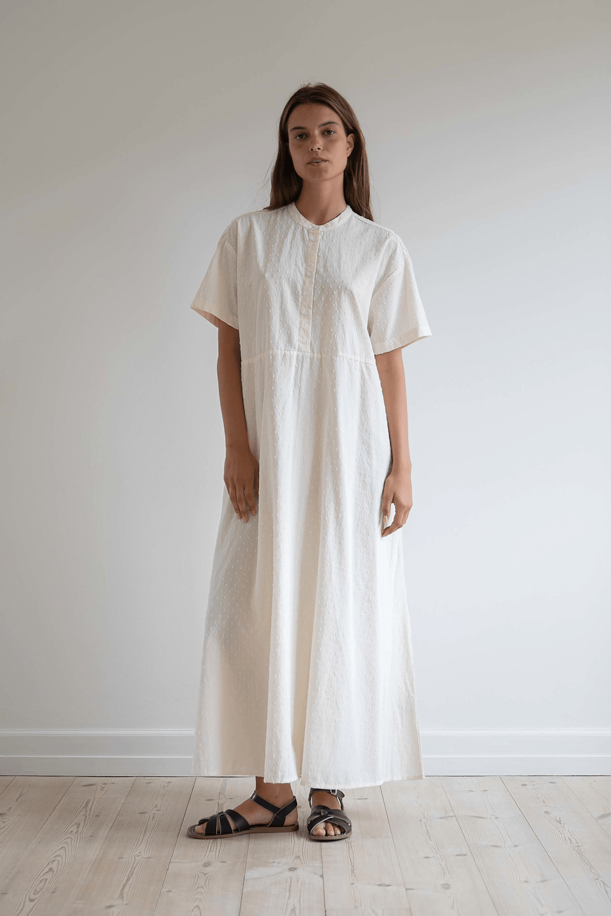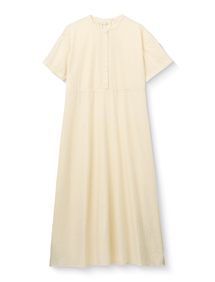 Lea kjolen er en let sommerkjole med et løst og luftigt look. Den har kinakrave, stolpe med knapper fortil og korte ærmer. En overskæring i taljen giver kjolen en smuk silhuet.