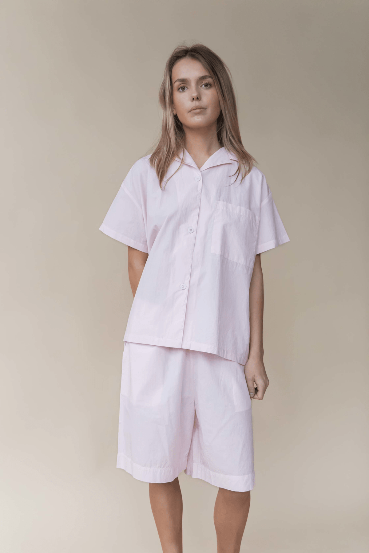 Flotte shorts i en let, økologisk bomuldspoplin. Shortsene har en løs silhuet, smalt elastikbånd i taljen og to praktiske sidelommer. Alle indvendige syninger er med franske sømme for en delikat og luksuriøs finish.Norah shorts er lidt længere og mere klassiske i udtrykket end vores Jasmin shorts. Sæt dem sammen med en skjorte eller t-shirt, og få et fint sommerligt sæt, der både kan bruges på stranden og i byen.