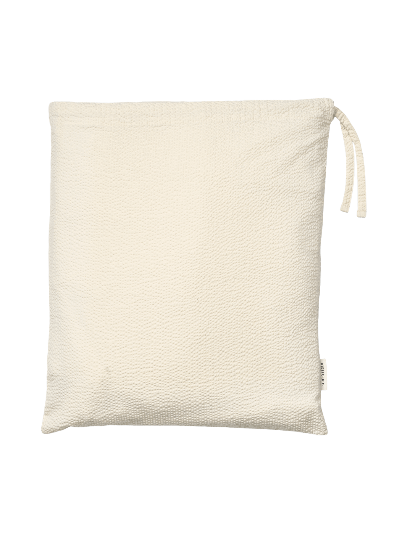 Sengetøjet leveres i en matchende stofpose, der lukkes foroven med bindebånd.