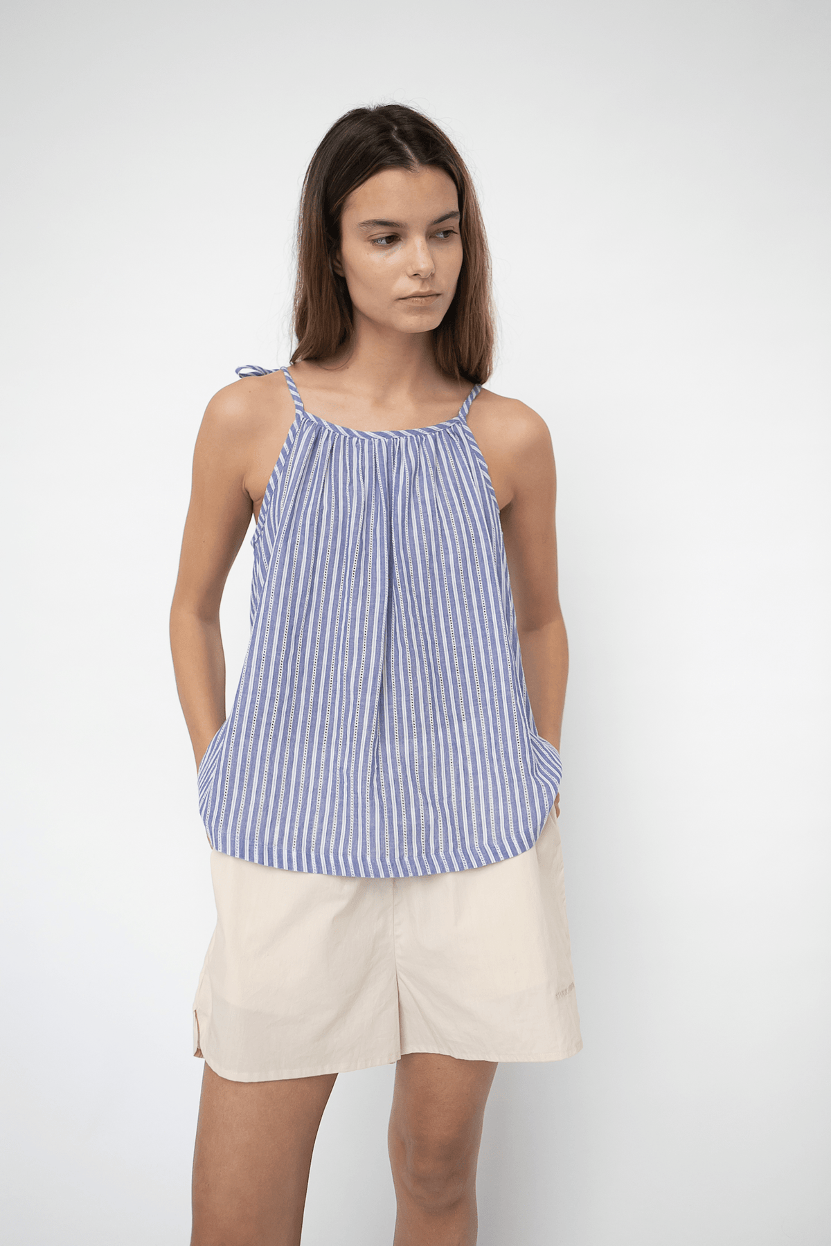 Løs stroptop i 100% økologisk bomuld. Toppen er ideel til varme sommerdage eller ferie og super er nem at hoppe i. Stropperne kan justeres, da man blot binder dem med som en sløjfe, så de får den fortrukne længde. Alle indvendige syninger er med franske sømme for en delikat og luksuriøs finish. Toppen har masser af vidde og kan nemt styles med et cool par shorts.
