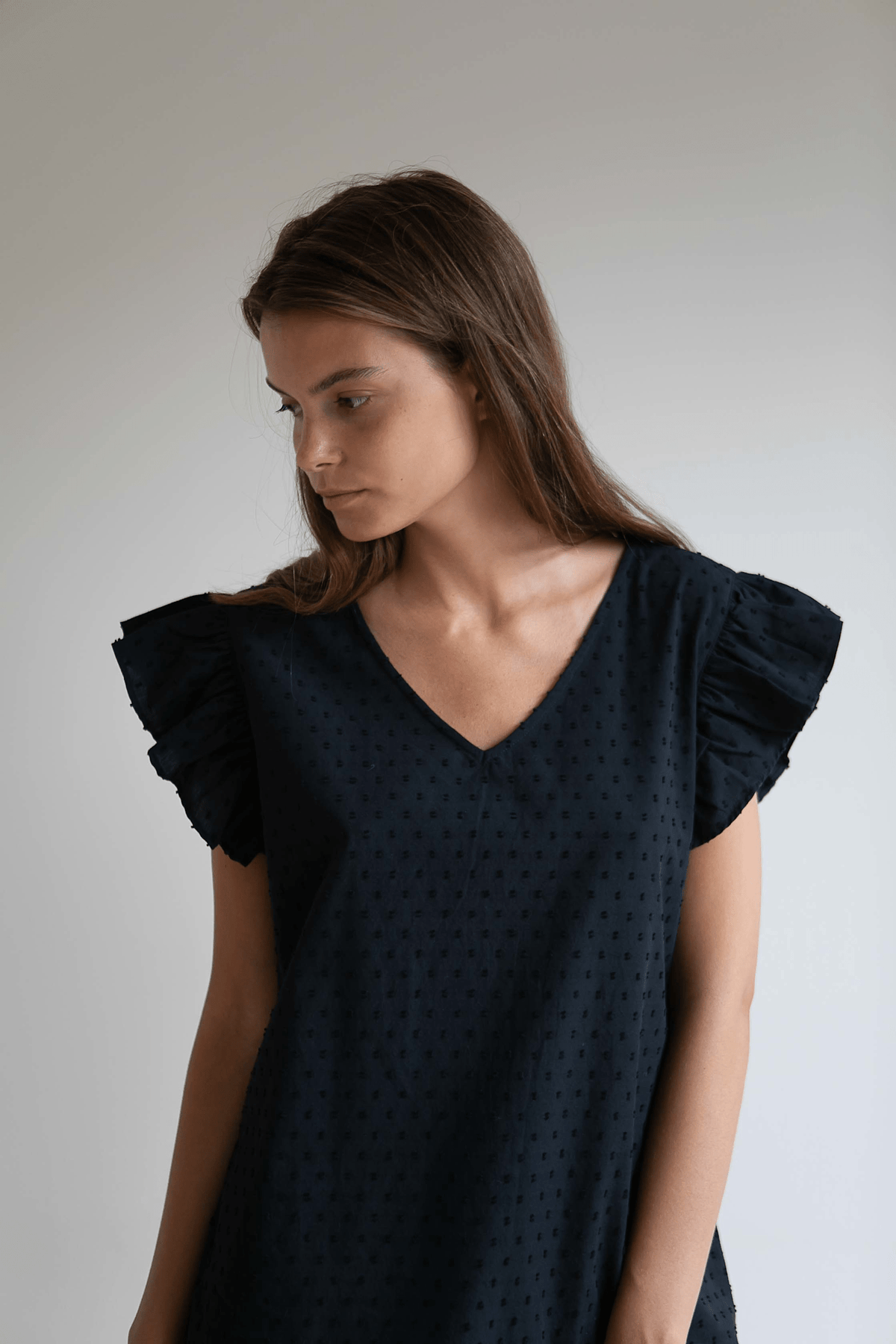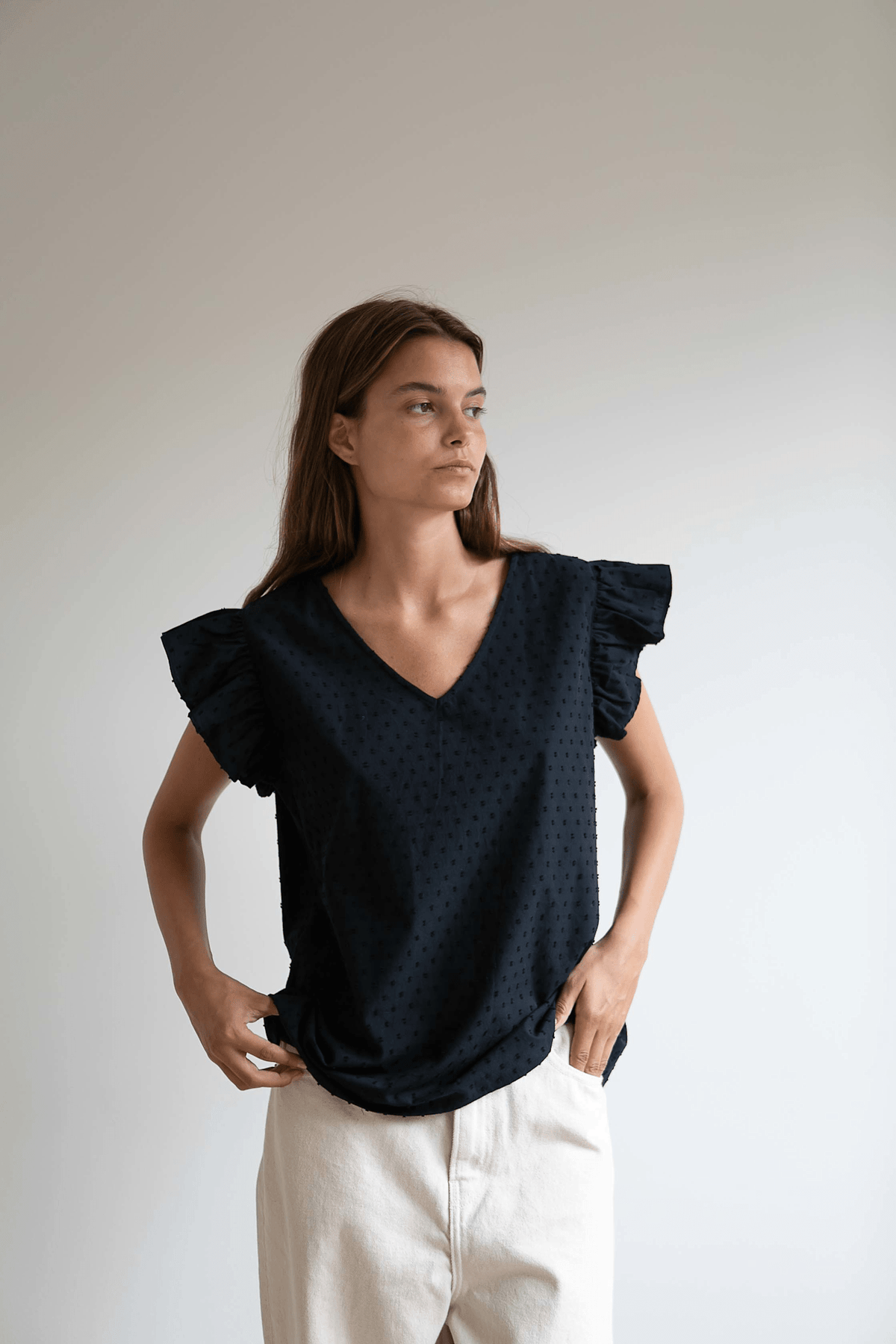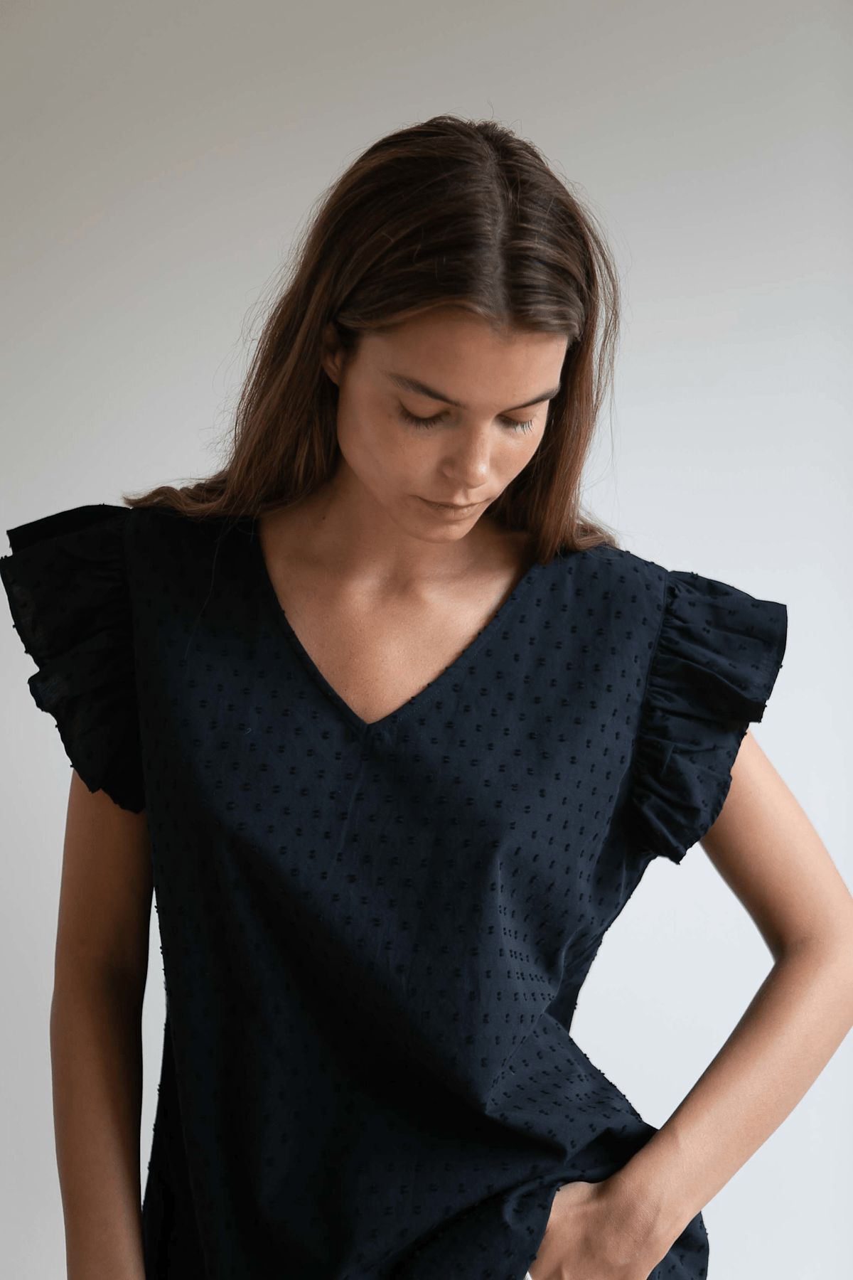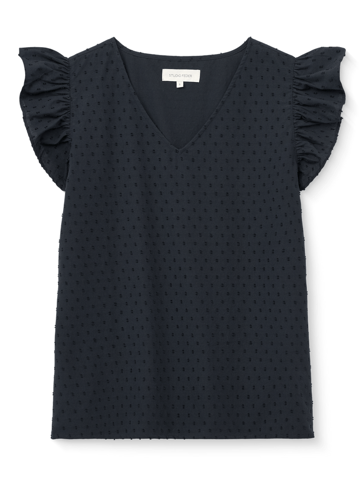 En feminin top med flæseærmer, der falder smukt, og en blød V-hals.