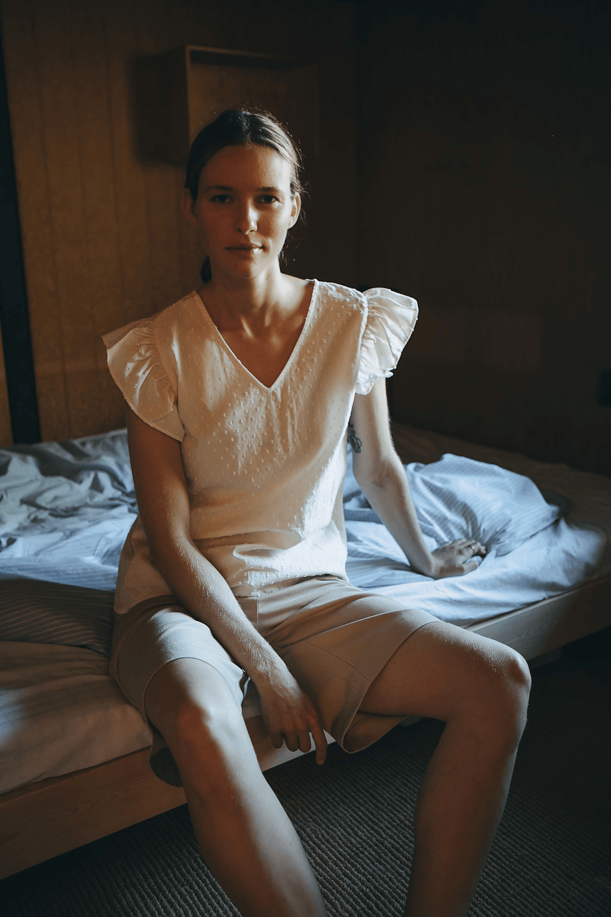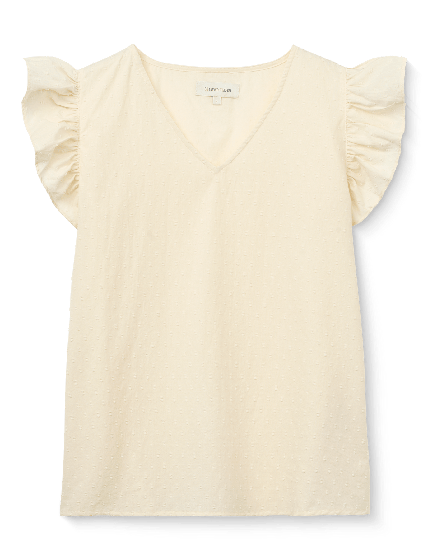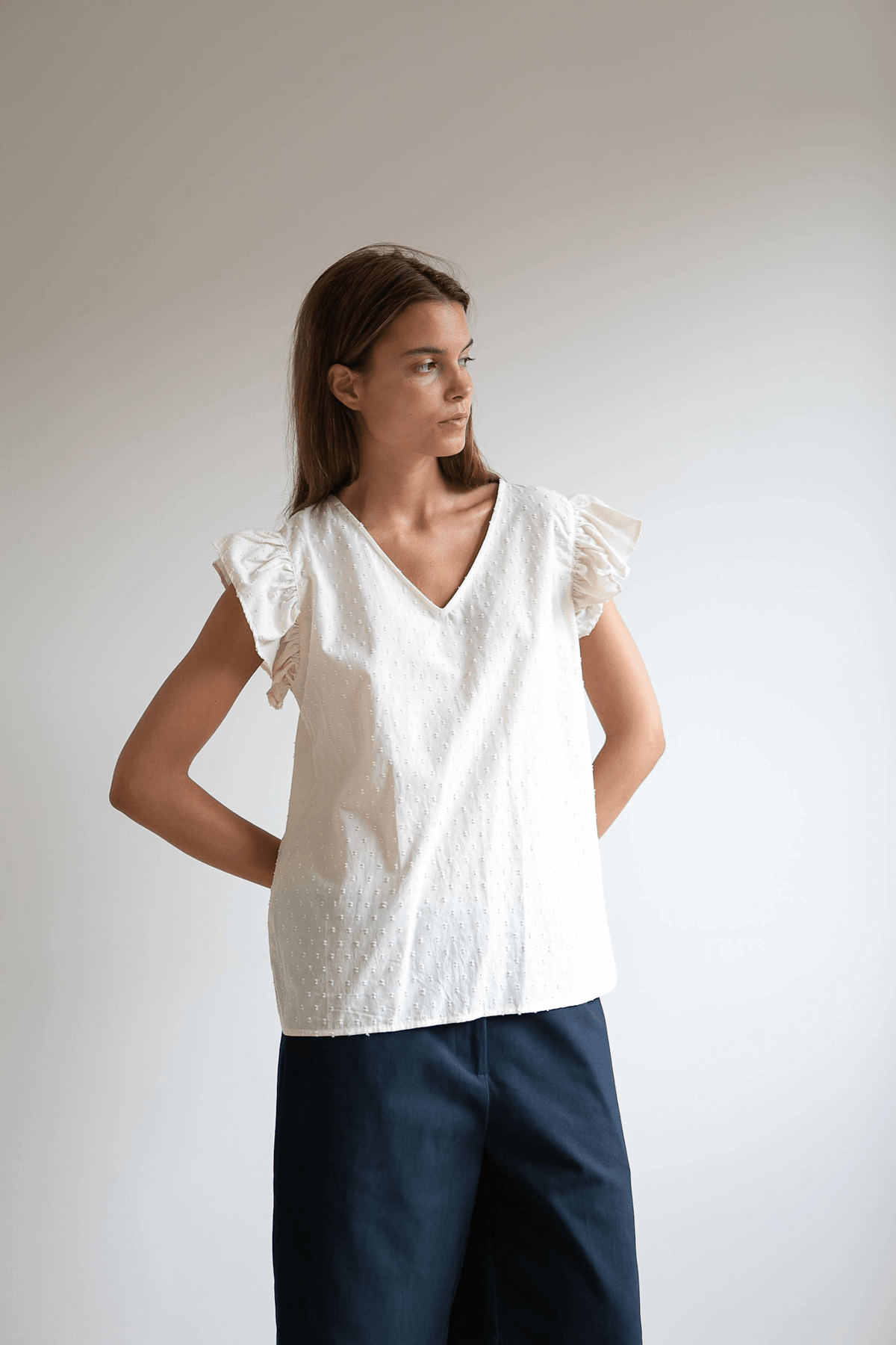 En feminin top med flæseærmer, der falder smukt, og en blød V-hals.